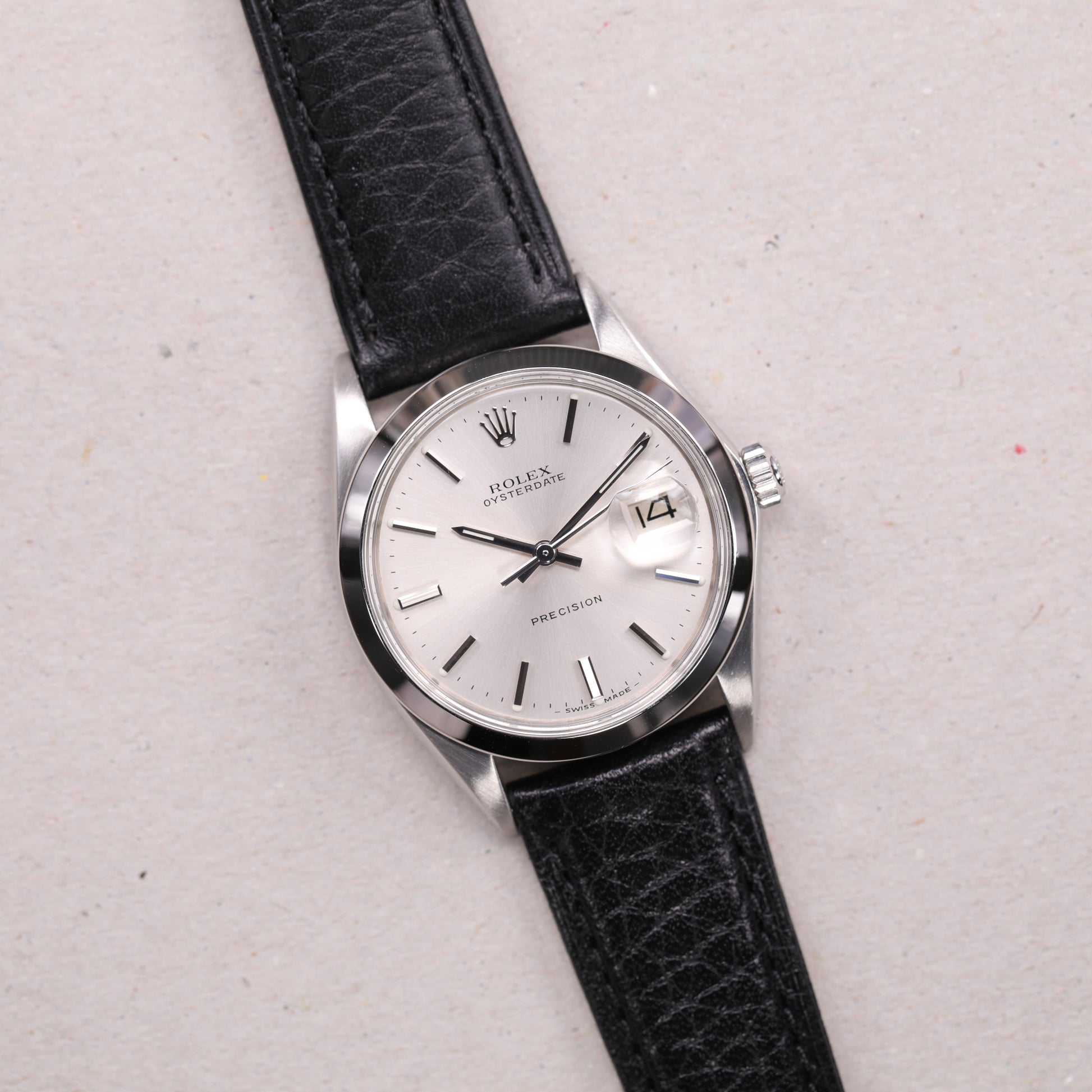 Superbe Rolex Oysterdate Precision référence 6694 en acier inoxydable, cadran argent, mouvement manuel, année 1971. Le présent modèle est monté sur un bracelet en cuir. Une montre classique et élégante, idéale pour les amateurs de Rolex vintage.